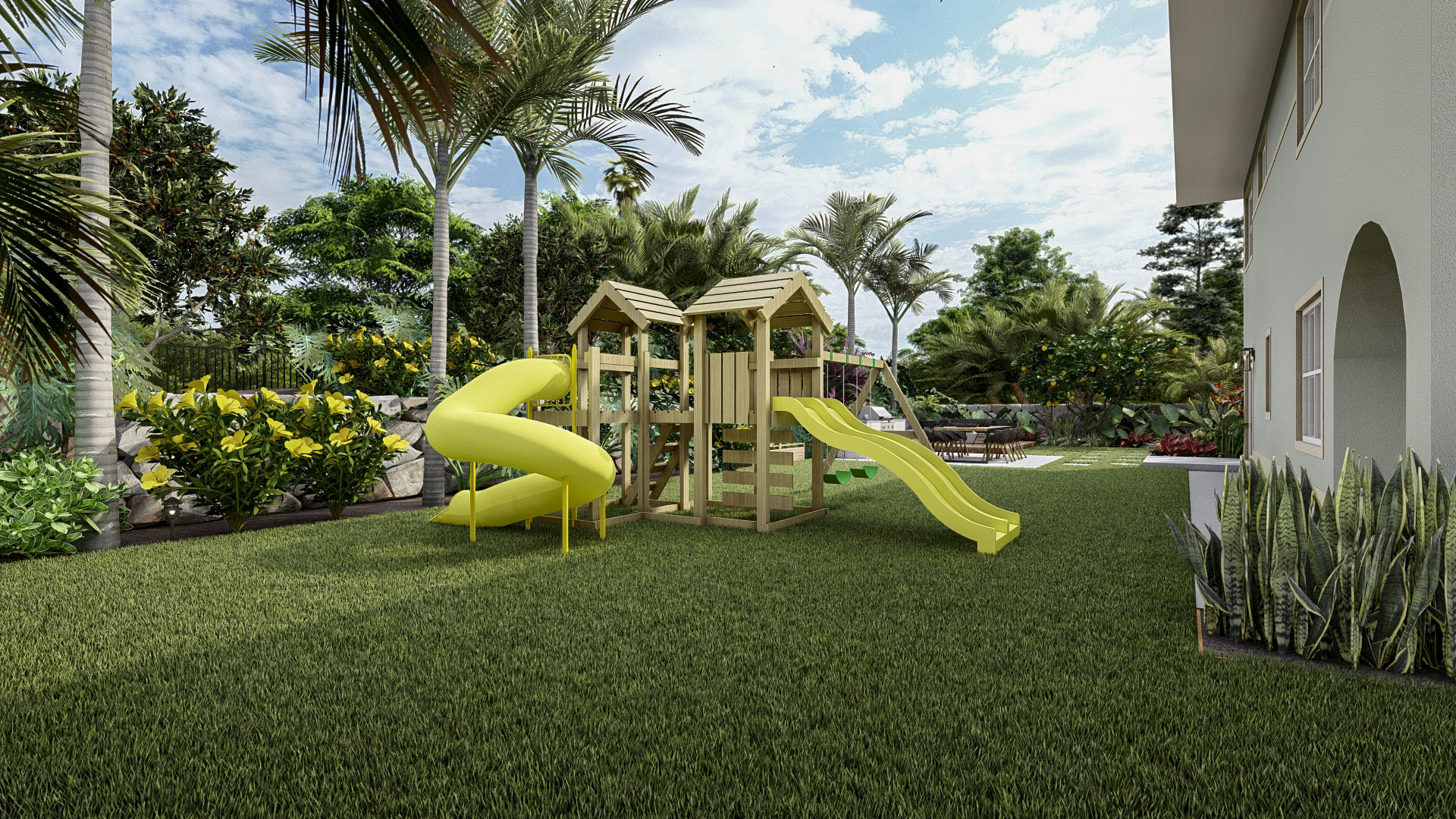- Family Play Zone: The design includes a dedicated lawn and play area with a substantial wooden structure, ensuring the property is both a sophisticated retreat for adults and an engaging space for children.