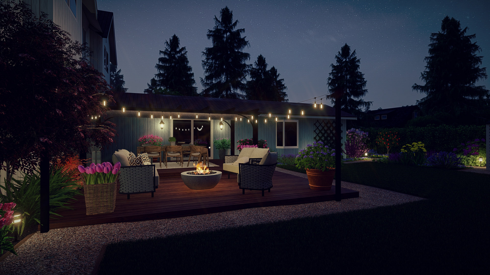- Thoughtful Lighting: The entire yard is designed for evening enjoyment, with subtle path lighting and decorative string lights over the deck, creating a warm and inviting ambiance after sunset.