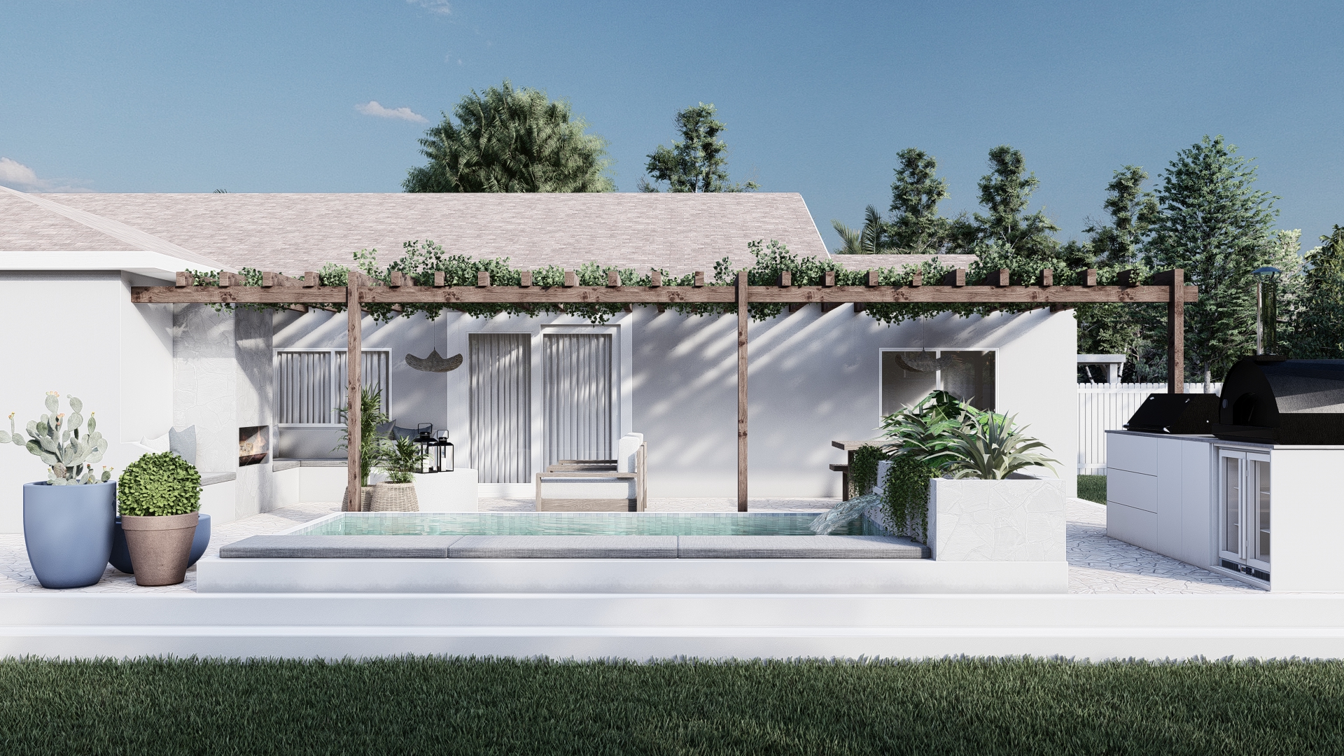 Discover this Modern Minimalist California backyard featuring crisp white stucco architecture and warm wooden shade pergolas. The design includes an elevated plunge pool, a built-in outdoor fireplace lounge, and a full kitchen, creating a chic, tropical-inspired retreat.