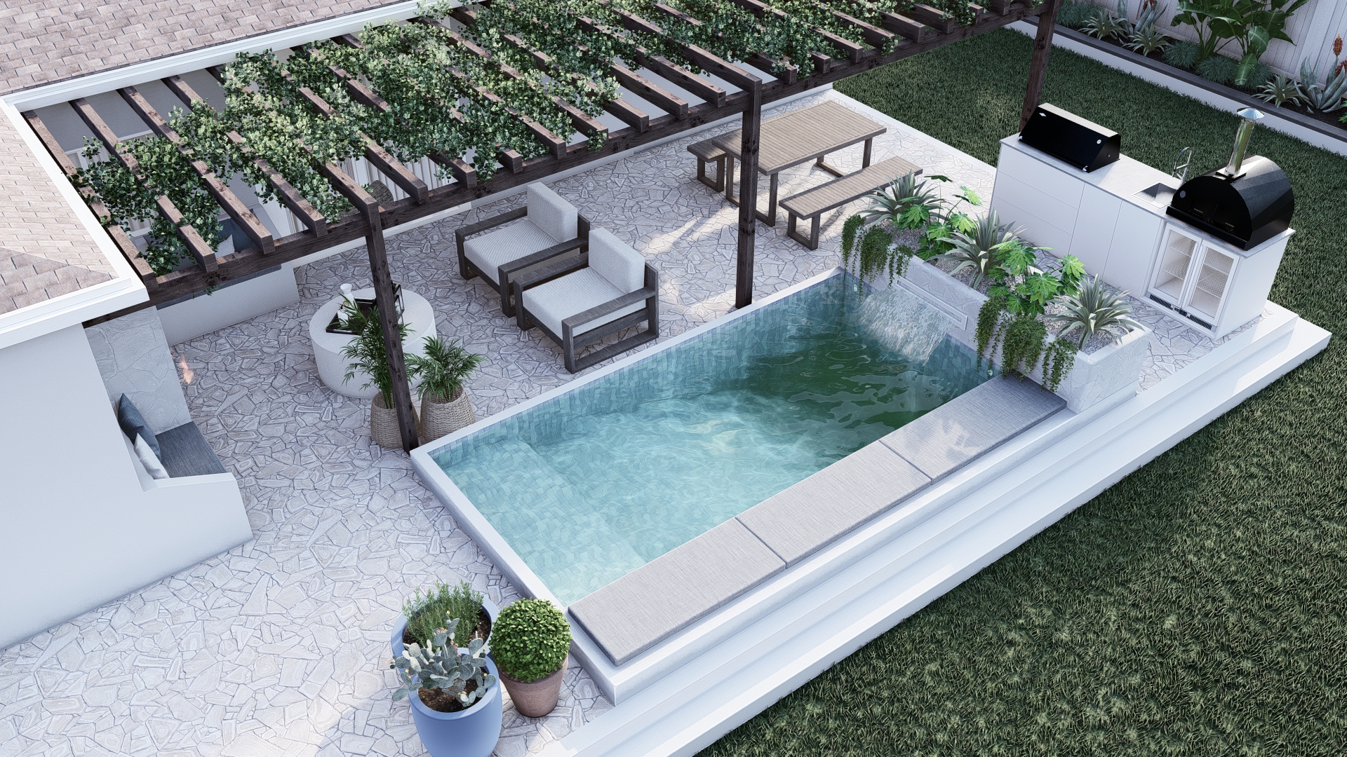 - Minimalist Outdoor Kitchen: A dedicated station features a simple, clean white stucco kitchen counter housing a grill and cooler, keeping the focus on sleek functionality.